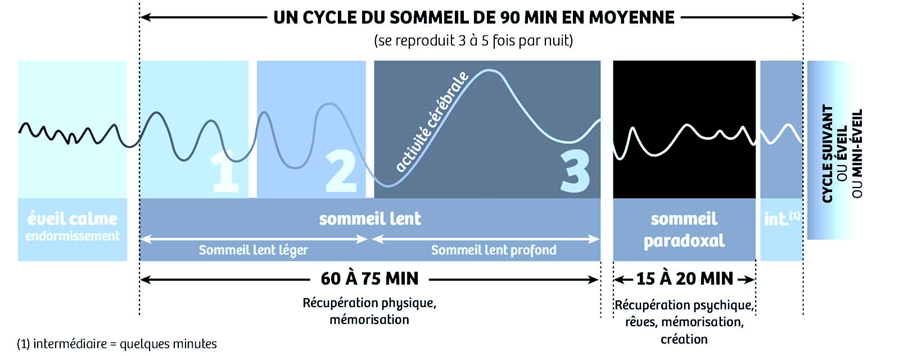 Tout d’abord, il faut savoir que le sommeil se décompose en plusieurs cycles différents. On retrouve en effet le sommeil lent léger, le sommeil lent profond ainsi que le sommeil paradoxal (cf. schéma ci-dessous). Classiquement et sans trop rentrer dans le détail, la phase de sommeil lent permet avant toute une régénération sur les plans physiques et physiologiques. Cette phase est associée à un profond état de relaxation. De façon complémentaire, le sommeil paradoxal, également connu sous le nom de REM pour Rapid Eye Movement, permet quant à lui de régénérer les processus cognitifs liés par exemple à la mémorisation et à la créativité. Le sommeil paradoxal est associée à une activité cérébrale intense et à des mouvements très rapides et saccadés des yeux, d’où son nom de Rapid Eye Movement. C’est une phase survenant principalement en deuxième partie de nuit et qui est à l’origine des rêves que nous faisons.