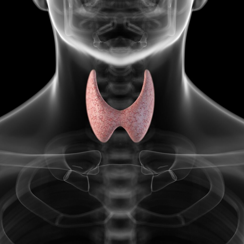 La thyroïde est une glande endocrine en forme de papillon située au niveau du cou (cf. photo N°2 ci-dessous). Elle représente en quelque sorte le « thermostat » du corps et son rôle dans la régulation du métabolisme est fondamental : la thyroïde permet en effet de réguler la production de chaleur et d’énergie au sein des mitochondries de nos cellules. Pour rappel, les mitochondries représentent des petites structures à l’intérieur de nos cellules, en charge notamment de la production d’énergie.